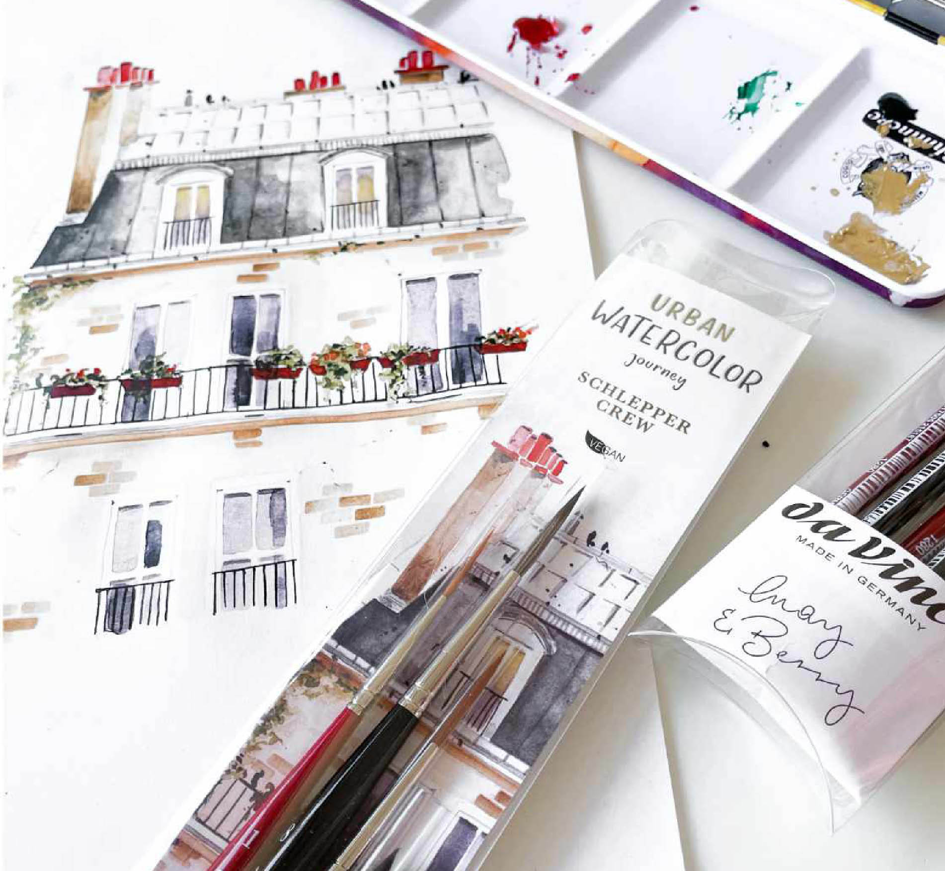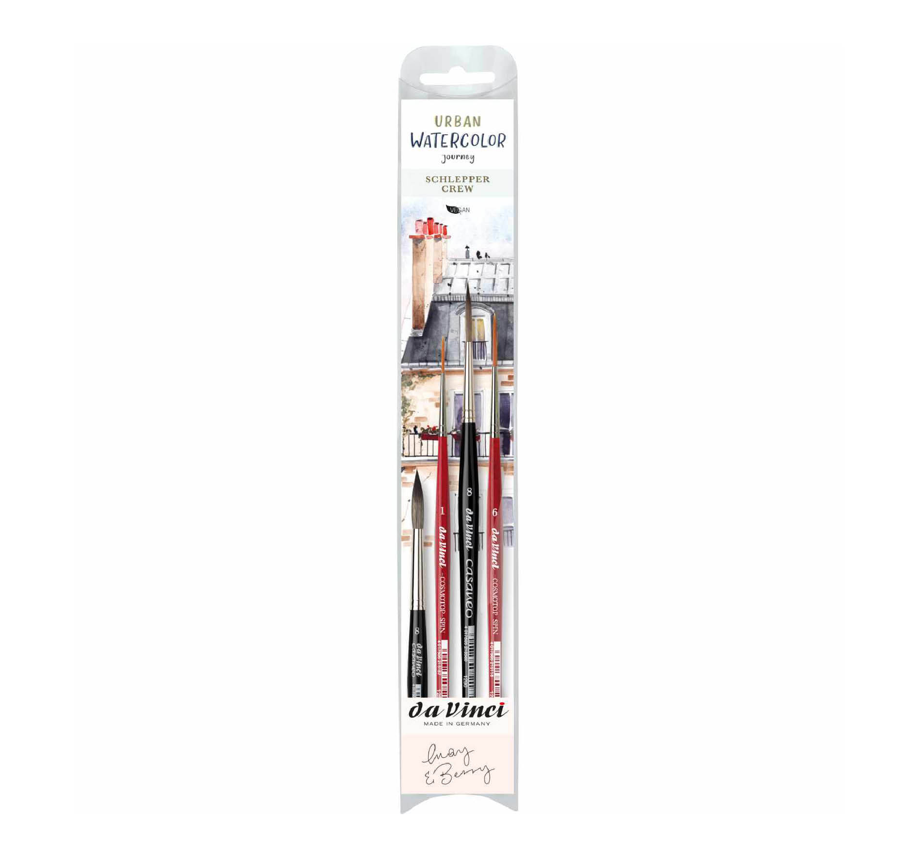 Das Pinsel-Set für Urban Watercolor Schlepper Crew ist die perfekte Ergänzung zum neuen Buch Urban Watercolor Journey – die Reise geht weiter von Sue Hiepler.