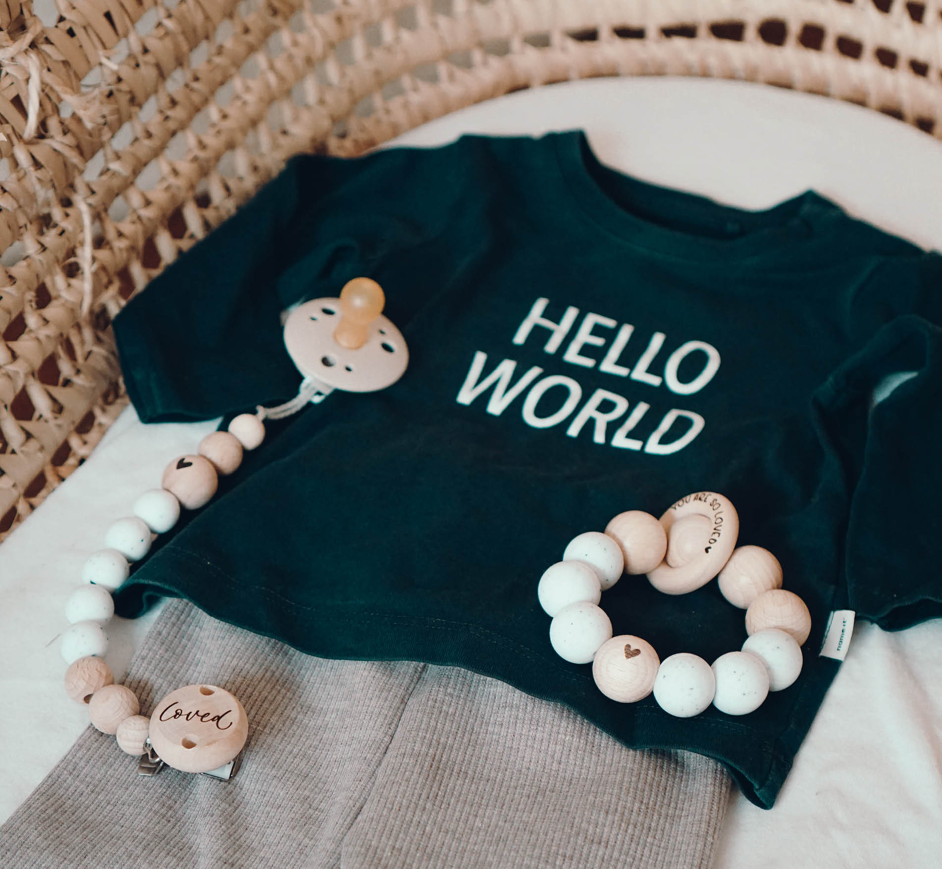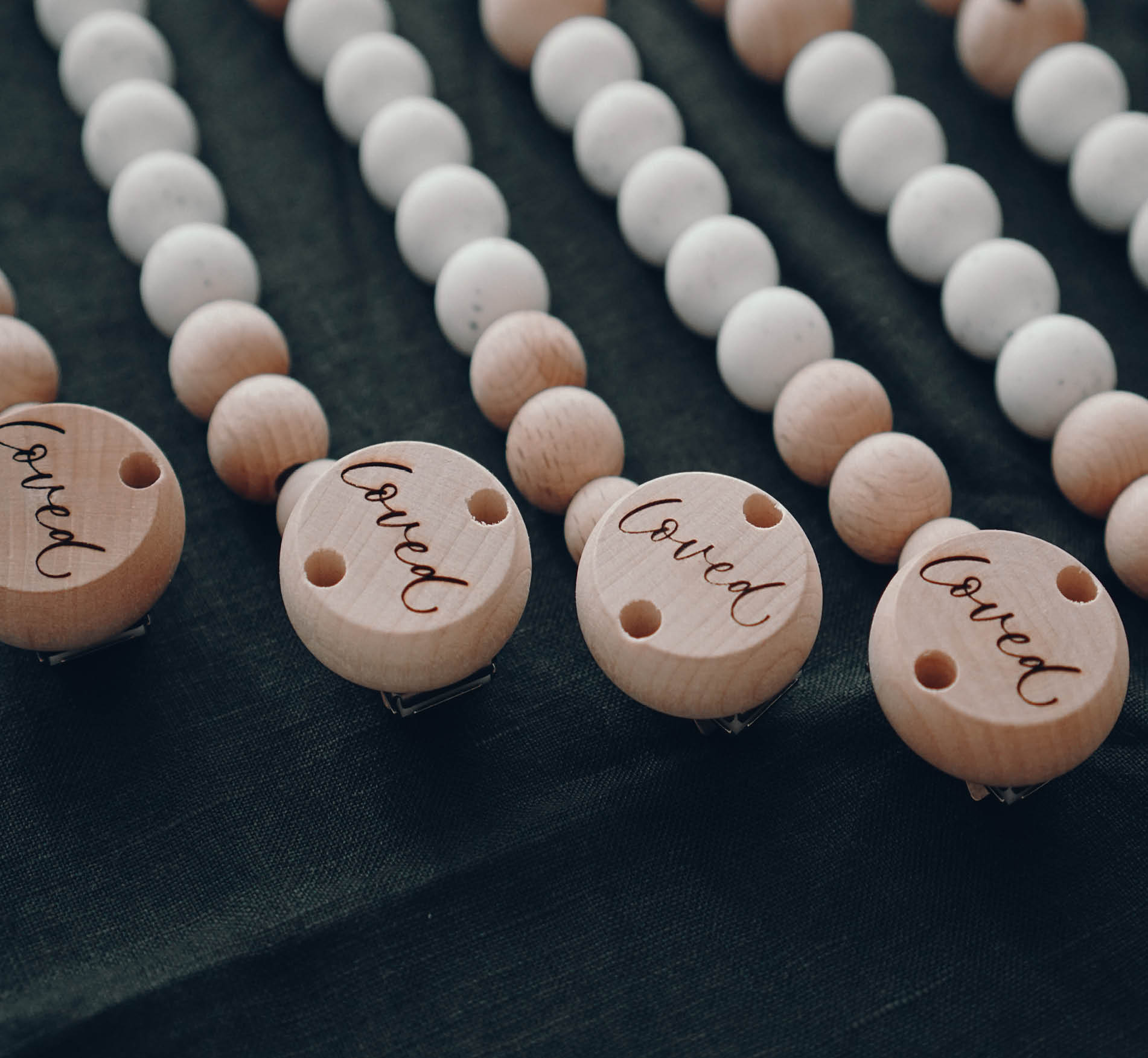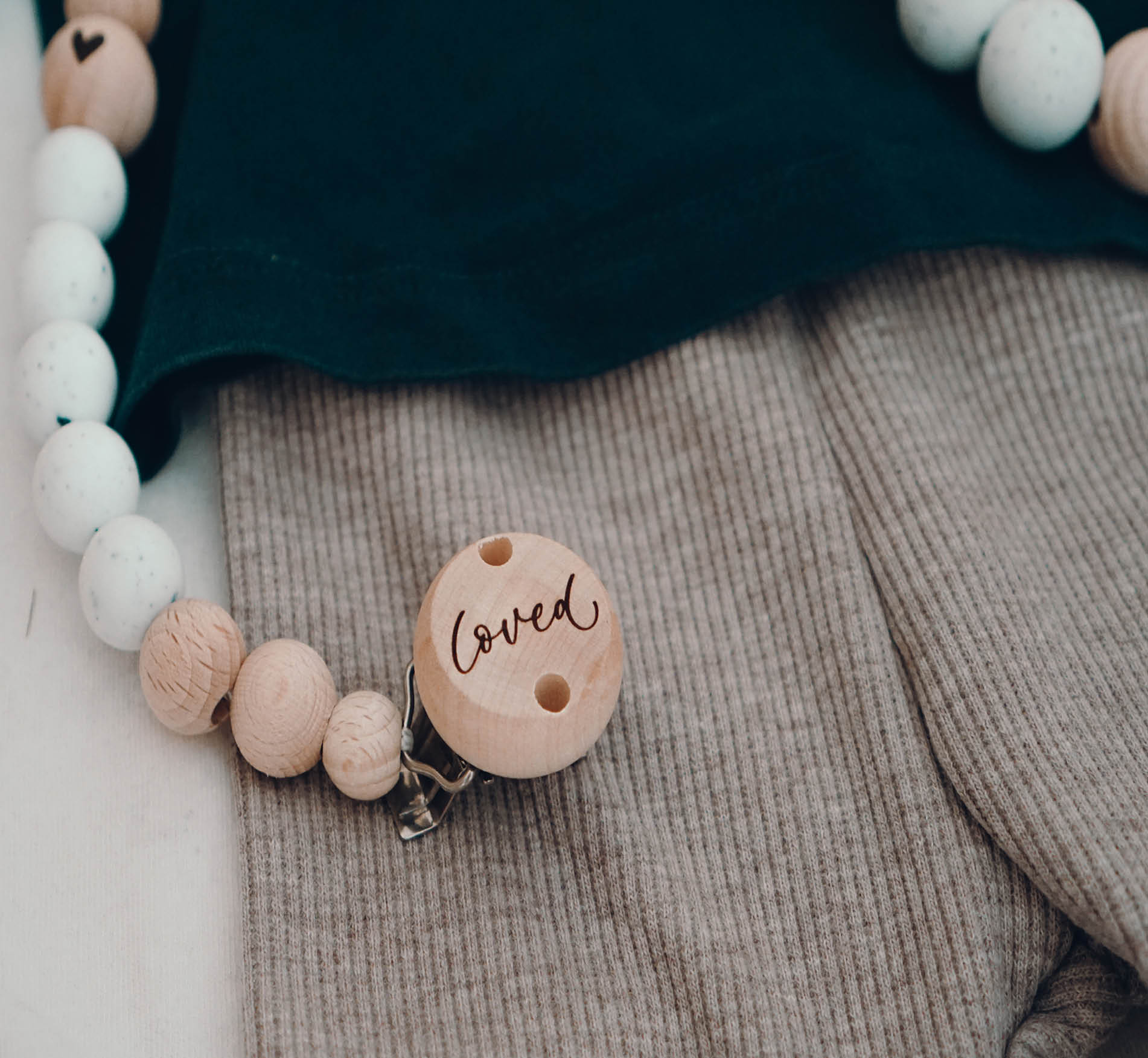 Die Schnullerkette „Loved“ wird in liebevoller Handarbeit von liebstemanufaktur hergestellt. Sie enthält einen Clip mit der Gravur „Loved“ und eine Mischung aus Silikonperlen in der Farbe Gritty weiß und Holzperlen. Ein weiteres Detail ist das kleine gravierte Herzchen auf einer der Holzperlen.