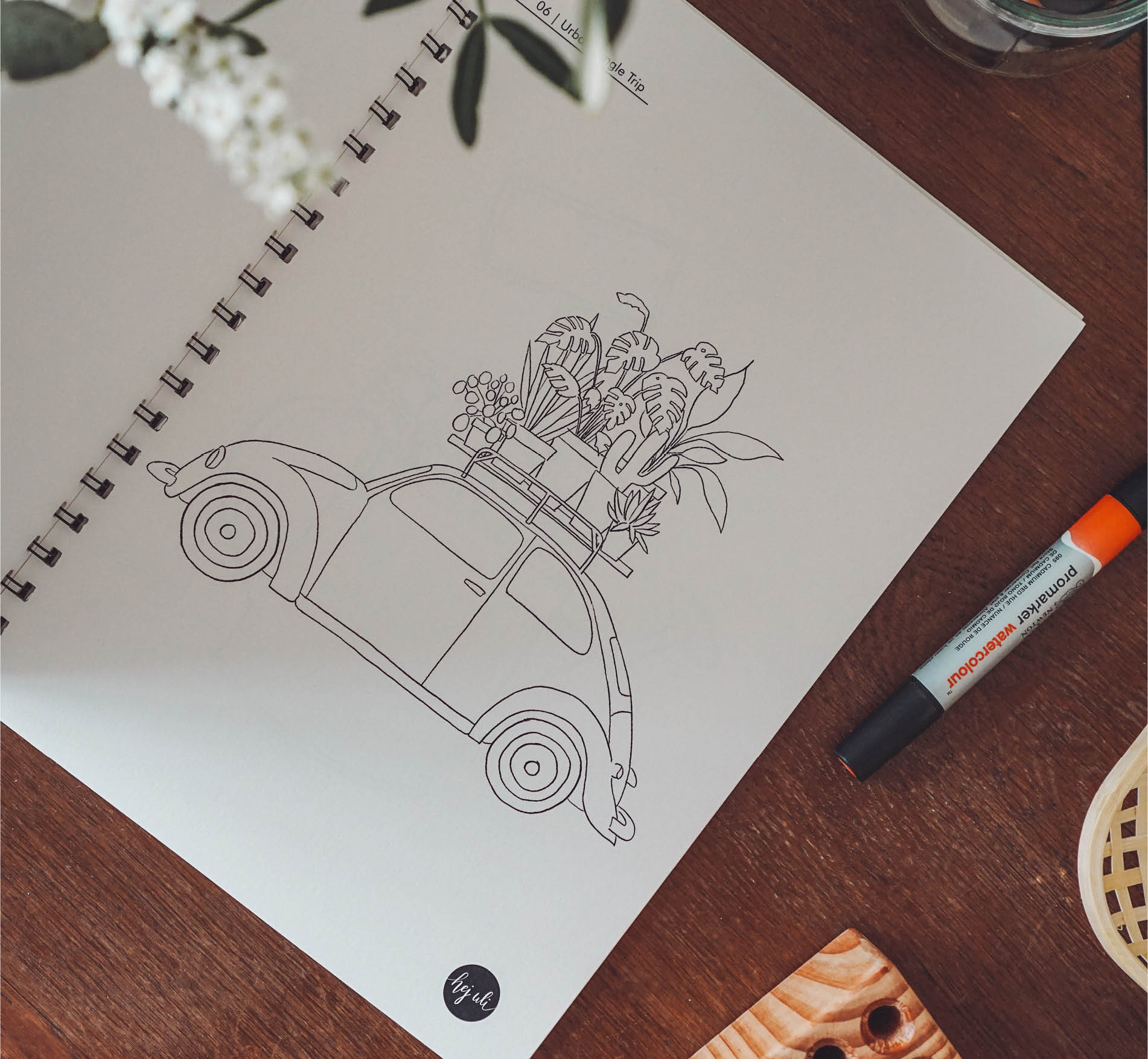 Kreativbooklet mit Malvorlagen von hej.uli auf Aquarellpapier gedruckt. Das Booklet enthält eine farbige Vorlage in Postkartengröße von jedem Design, sowie insgesamt 12 Motivvorlagen zum Ausmalen und selbst gestalten.